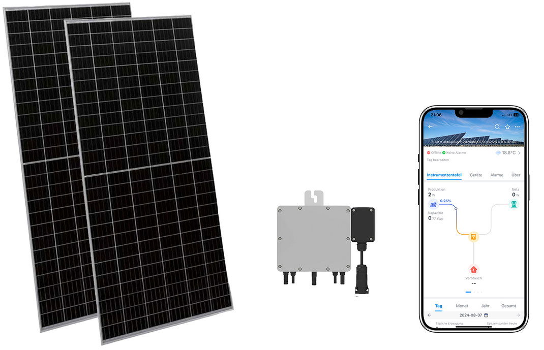 Balkonkraftwerk-Komplettanlage bestehend aus 2 Solarmodulen, Wechselrichter und einer App zum Monitoring.